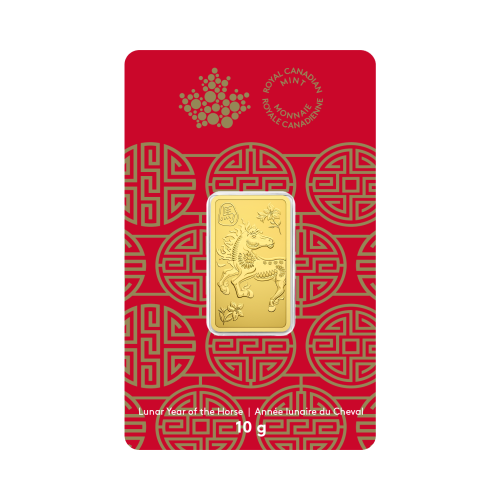Why is this called Premium Bullion? Your Premium Bullion bar comes presented in custom designed, Lunar Year of the Horse themed packaging. Each 10 g Lunar Year of the Horse bar comes hermetically sealed in custom tamper-evident packaging that highlights the traditional gold and red of the holiday, thus providing a stunning presentation and an extra layer of security to protect your investment.